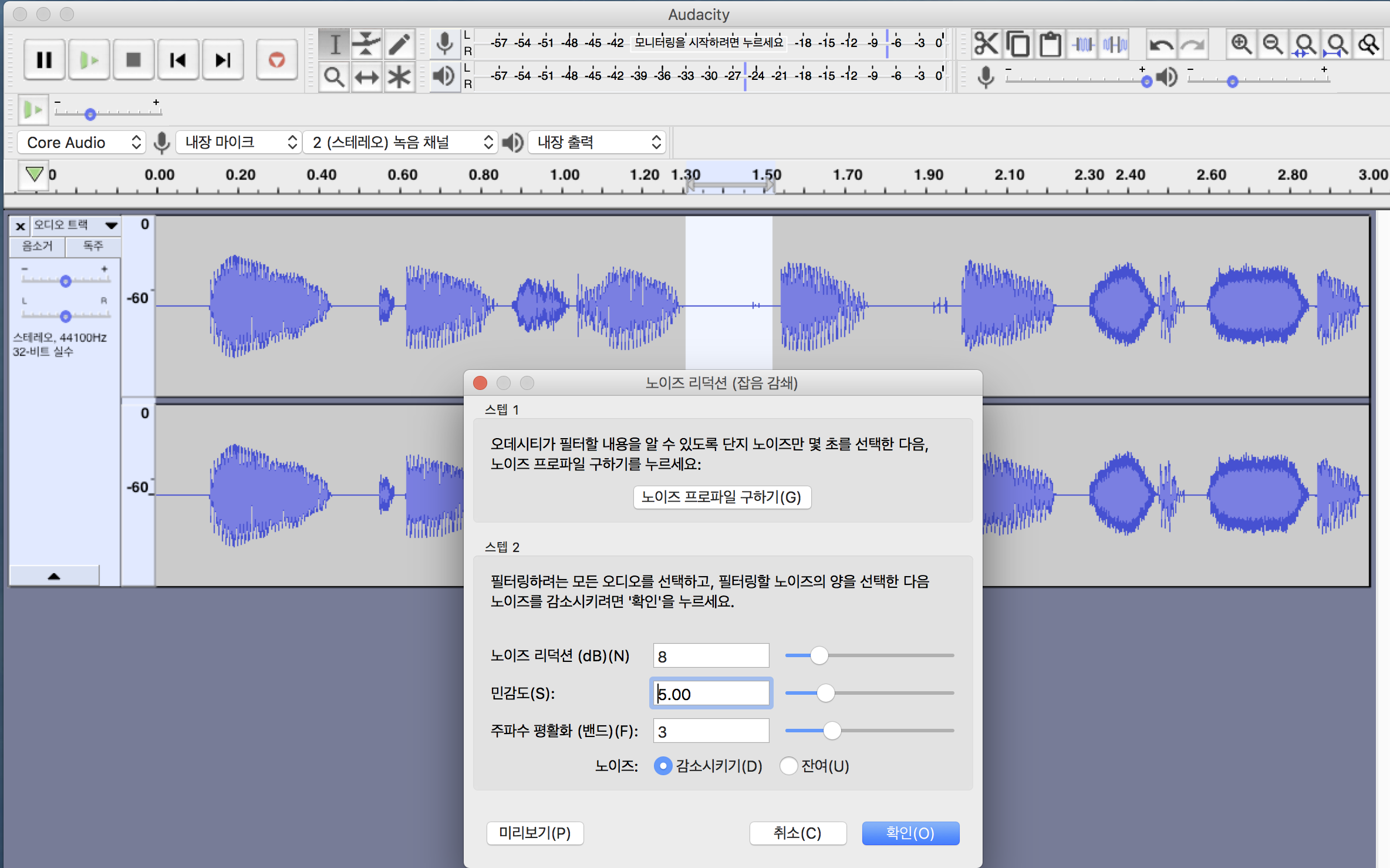 Audicity 에서 음원들에 잡음을 줄이는 작업