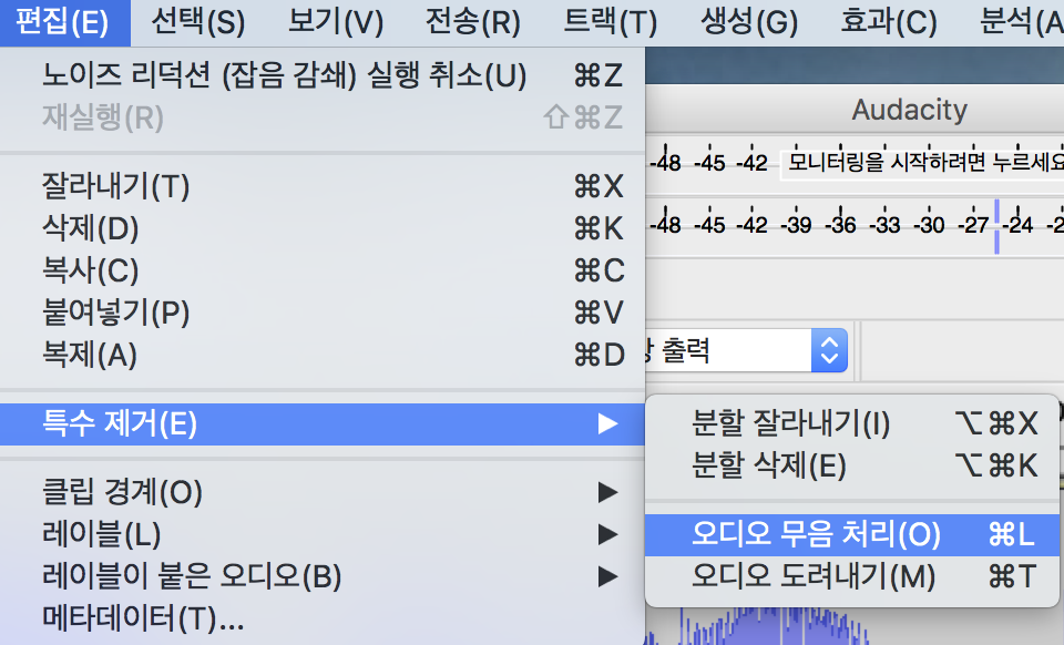 여기에 필요시 무음을 원하는 구간을 선택해 편집->특수제거->오디오 무음 처리 를 실행하면 선택된 구간이 완전 무음 처리된다.