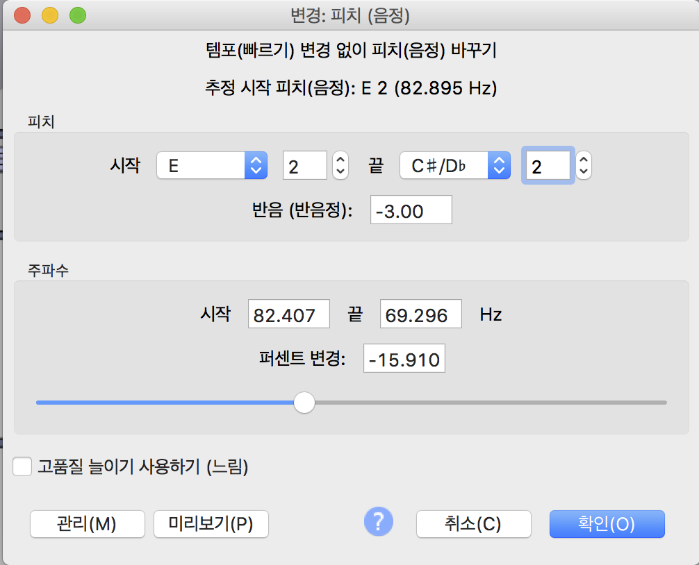 먼저 오디오의 전체 혹은 특정 부분을 선택하고 효과->피치(음정) 을 실행하면